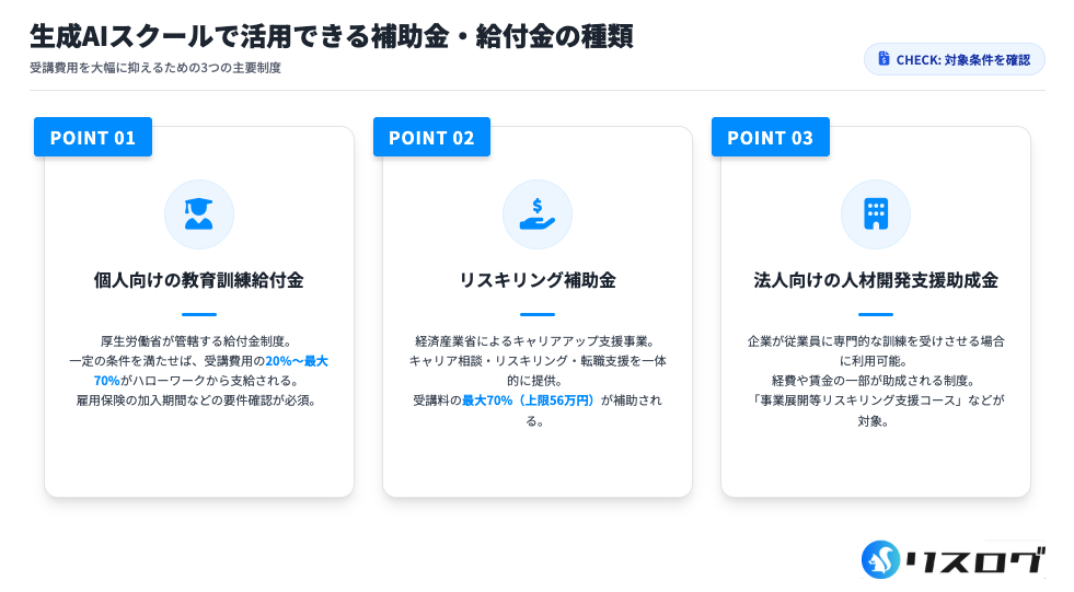 2024年から注目されているのが「リスキリング補助金」で、生成AIスクールでも適用対象となる場合があります。