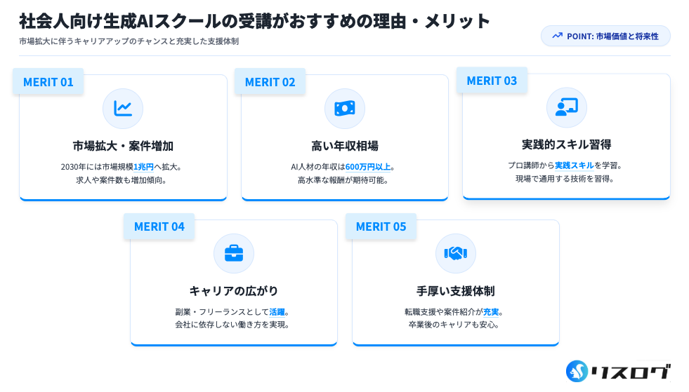 スクールでは実務レベルのAI活用方法を学べるため、転職・昇給・副業収入アップなど幅広いキャリアメリットにつながります。