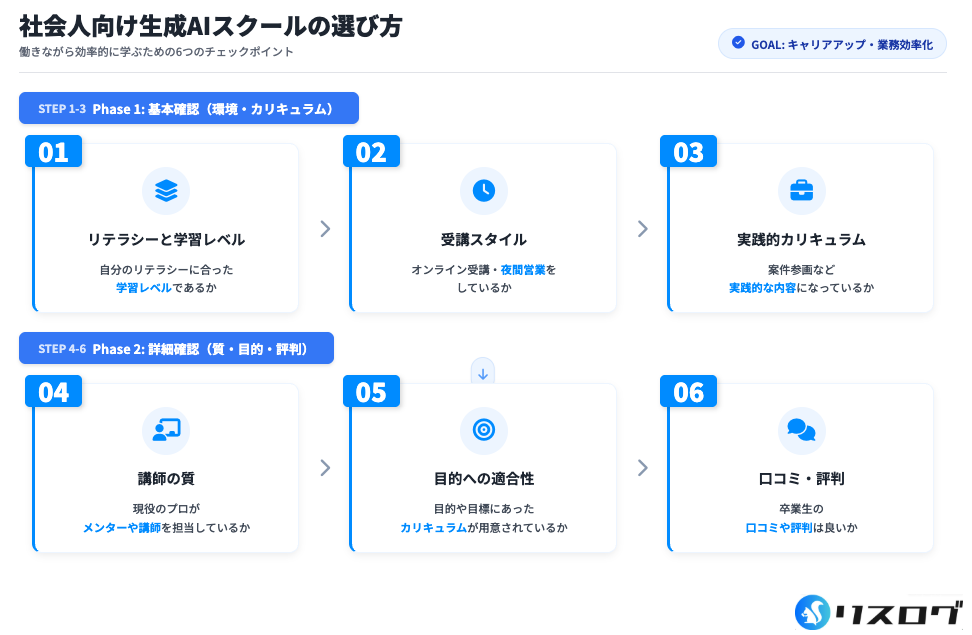 特に2024〜2025年は生成AIスクールが急増しており、質の差も大きいので、口コミチェックは必須です。