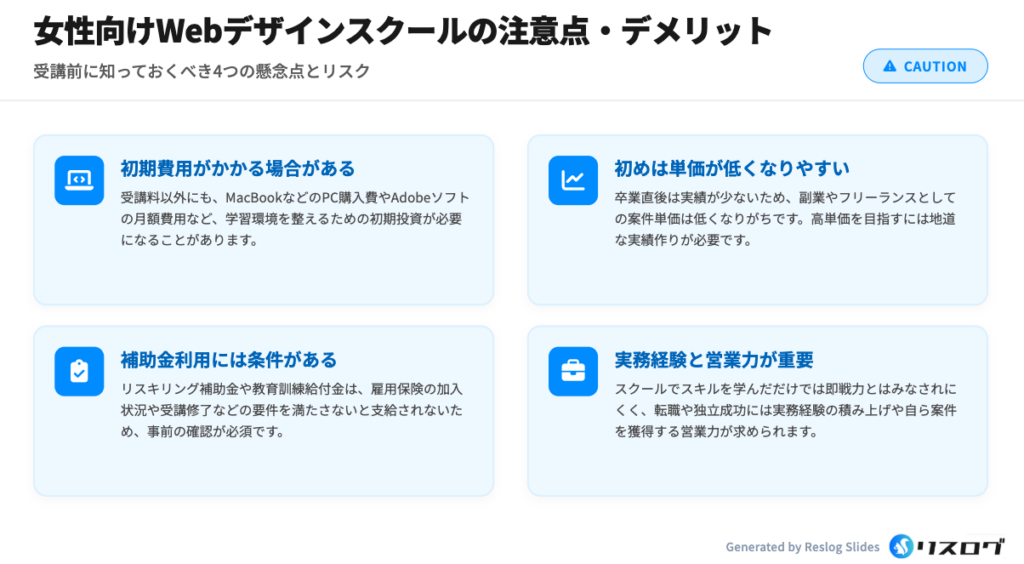 そのため自己管理能力やモチベーションの維持が求められます。さらに、受講料は他のオンラインスクールと比較してやや高めに設定されているため、費用対効果を考慮して検討することが重要です。