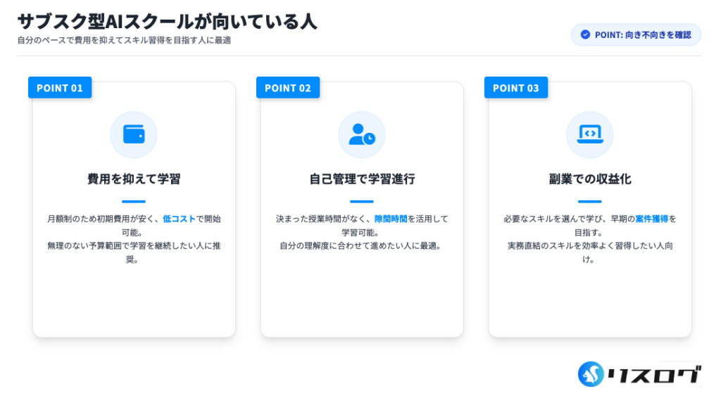 サブスク型AIスクールは、初期費用を抑えて学習を始めたい方に向いています。