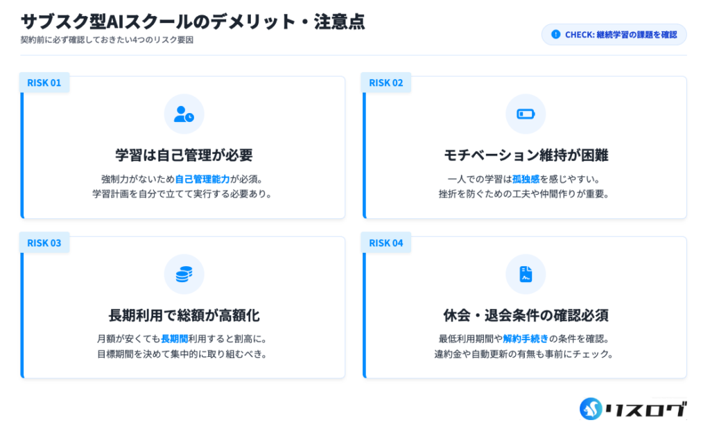 このように、DMM 生成AI CAMPは魅力が多い一方で、学習継続・自己管理・スキルの掛け合わせといった点も踏まえて検討することが大切です。