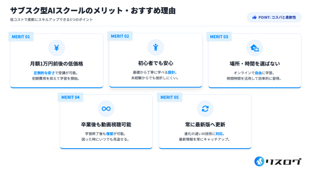 サブスク型AIスクールの最大の強みは、月1万円前後という低コストで最新スキルを学べることです。