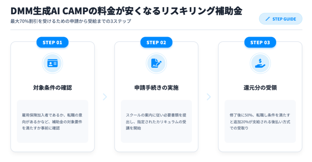 DMM生成AI CAMPは、リスキリング支援制度を活用することで受講料が最大70%割引になります。