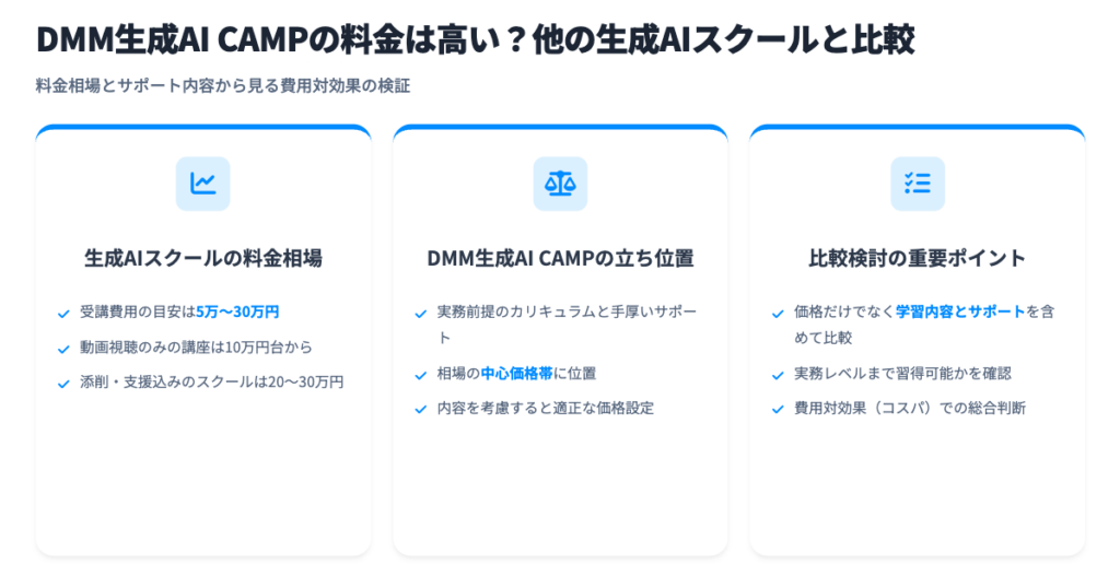 その中でDMM生成AI CAMPは、実務活用を前提としたカリキュラムや手厚いサポートを含みながら、相場の中心帯に収まっている点が特徴です。