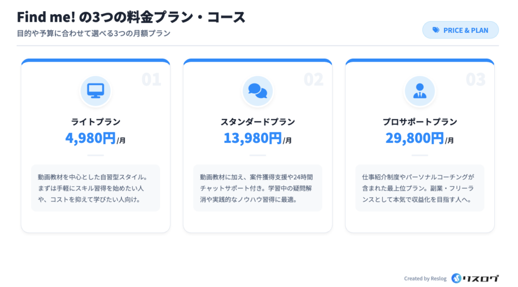 ライトプランは、Find me!の中で最も料金を抑えたエントリープランで、月額4,980円から受講できます。