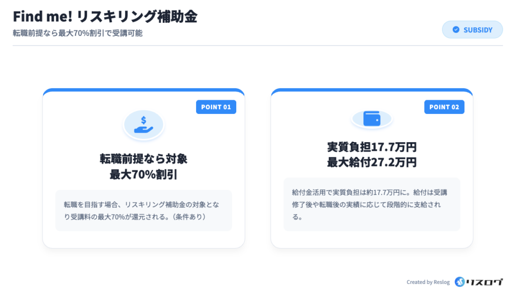 Find me!(ファインドミー)は、転職を前提として受講する場合にリスキリング補助金の対象となっており、受講料の最大70%が還元されます。