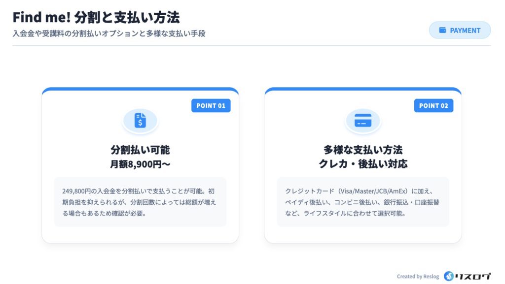 Find me!(ファインドミー)では、入会金249,800円を分割払いで支払うことが可能となっており、分割を選択した場合は月額8,900円〜の負担で受講をスタートできます。