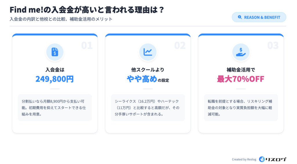今回はFind me! (ファインドミー!)の入会金や料金プランを他社スクールと比較しながら、リスキリング補助金の条件や分割払いについて解説していきます。