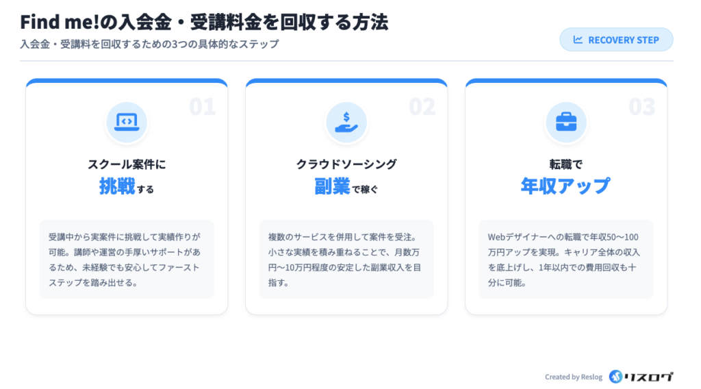 短期的な副業収入だけでなく、キャリア全体の収入を底上げする視点で考えると、Find me!への投資は回収しやすい選択肢といえるでしょう。