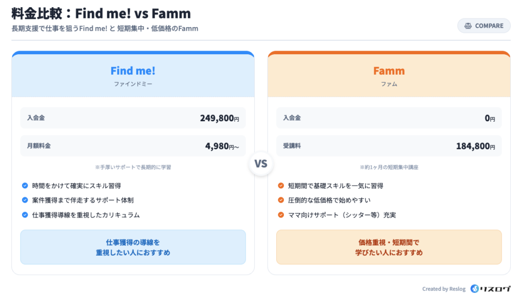 一方、Find me!は月額制で長期的に学習・支援を受けられる点が特徴です。Fammは「短期間で基礎を学びたい」「育児中で短期集中したい人」に向いており、Find me!は「副業・転職まで見据えて継続支援を受けたい人」向けです。