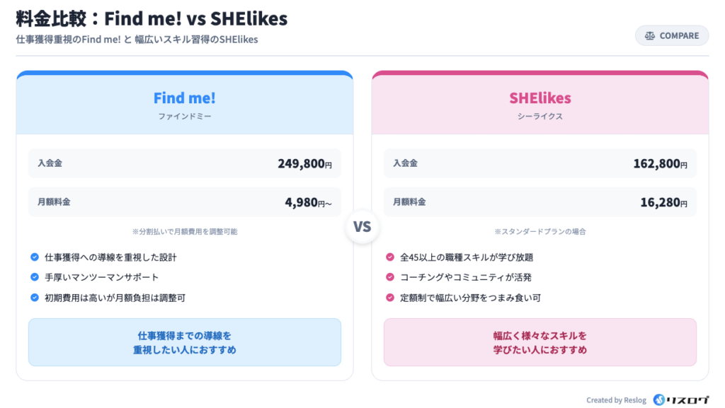 Find me!とシーライクスは、どちらも女性向けキャリアスクールとして人気がありますが、料金体系と学習スタイルに大きな違いがあります。