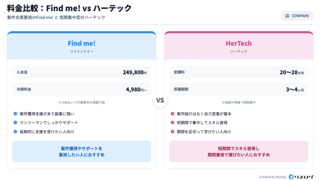 一方Find me!は、案件獲得支援やコミュニティがあり、副業初心者でも実績を作りやすい環境があります。期間重視ならハーテック、サポート重視ならFind me!がおすすめです。
