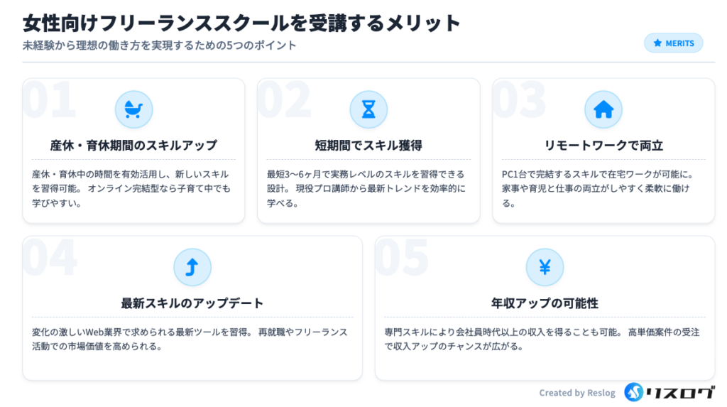 特に、多彩なコースを自由に受講できるため、複数のスキルを身につけ、副業やフリーランスを目指す女性に最適な環境となっています。