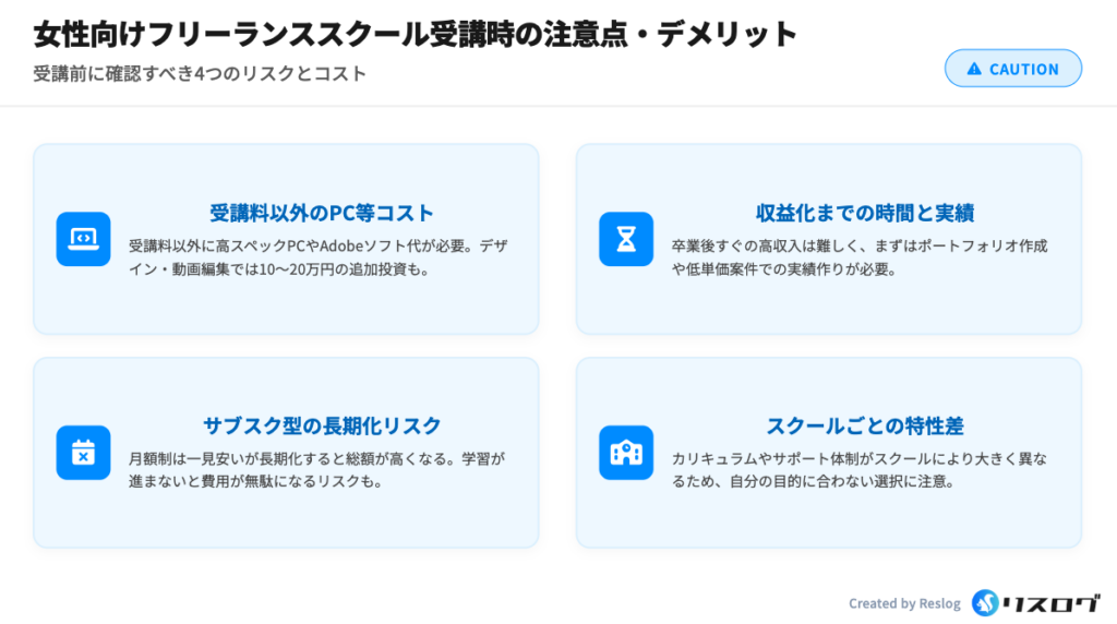 さらに、女性限定のため、男性や幅広い層との交流ができないという点もデメリットとして考えられます。受講前に、自分の目標や学習スタイルに合致しているか慎重に確認しましょう。