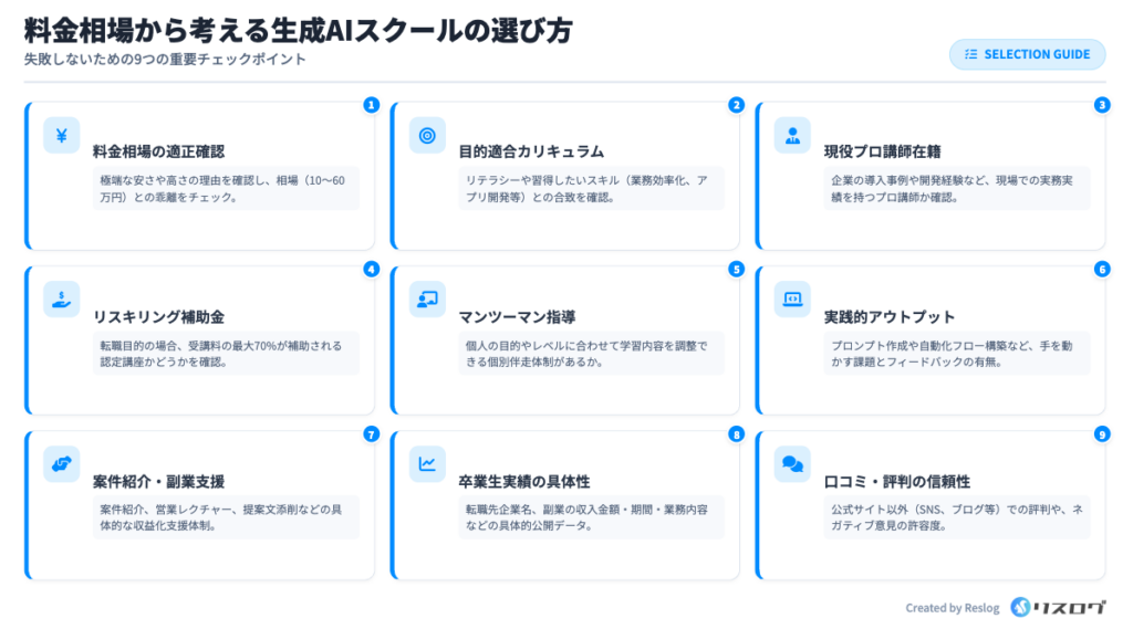 生成AI分野は変化が非常に早いため、カリキュラムが最新情報にアップデートされているかは重要なチェックポイントです。