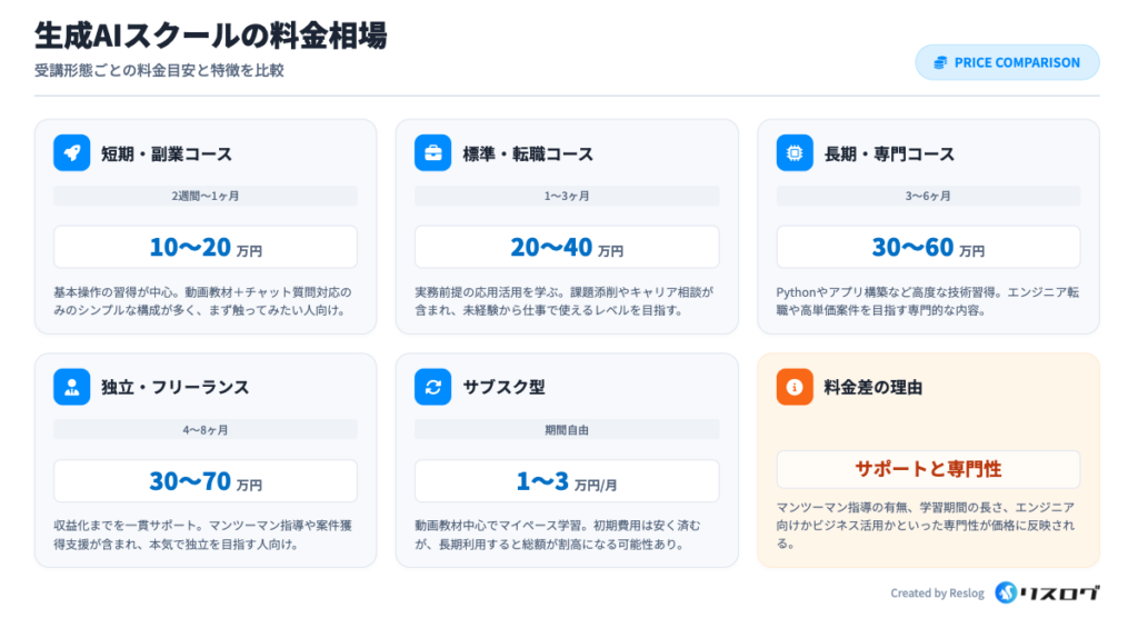 生成AIスクールを選ぶ際にまず確認したいのが、受講料金が相場から大きく外れていないかという点です。