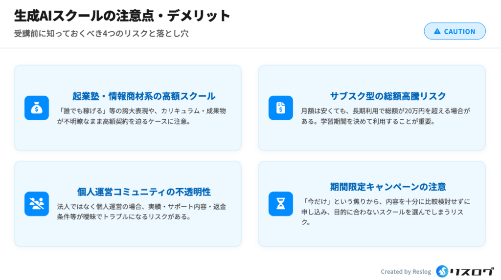 「AIで誰でも稼げる」「短期間で月収◯万円」といった強い訴求を前面に出し、具体的なカリキュラムやアウトプットが不明瞭なまま高額契約を迫るスクールには注意が必要です。
