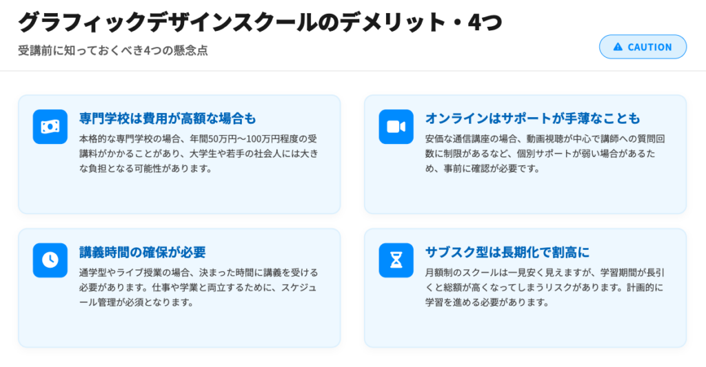さらに、受講料が他のスクールと比較して高めに設定されているため、費用対効果を十分に検討する必要があります。