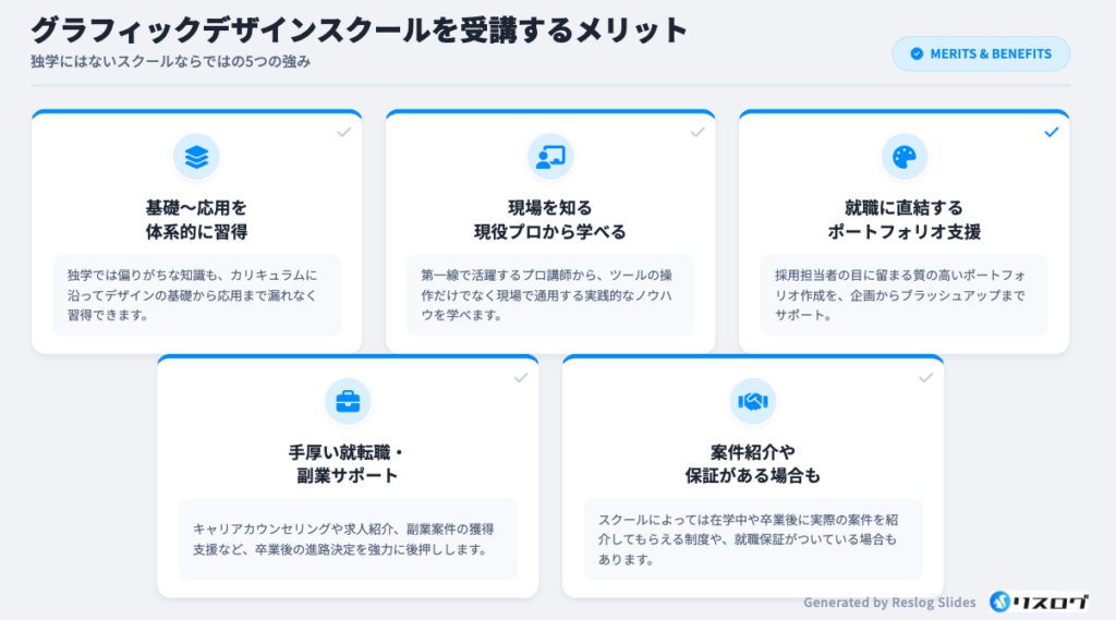 未経験からでも「実績の見せ方」を学べる点は、スクールならではの大きなメリットといえます。