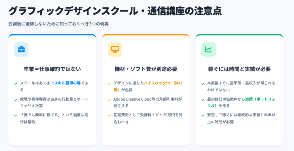 多くの講座は基礎的なデザインスキルを身につけるためのものであり、実際の仕事を獲得するにはポートフォリオ制作・営業活動・実務経験が欠かせません。