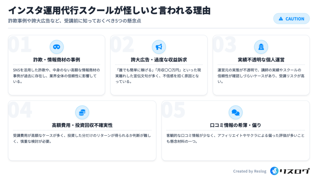 個人運営のインスタ運用代行スクールすべてが悪いわけではありませんが、運営情報や実績が不透明な場合は注意が必要です。