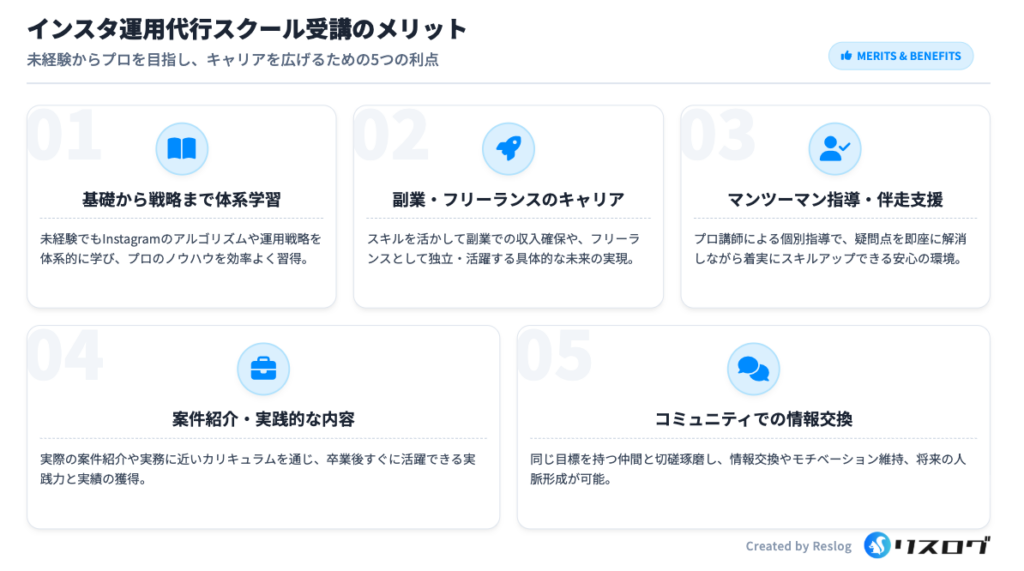 インスタ運用代行スクールの大きなメリットは、未経験者でもInstagramの基礎から戦略設計までを体系的に学べる点です。