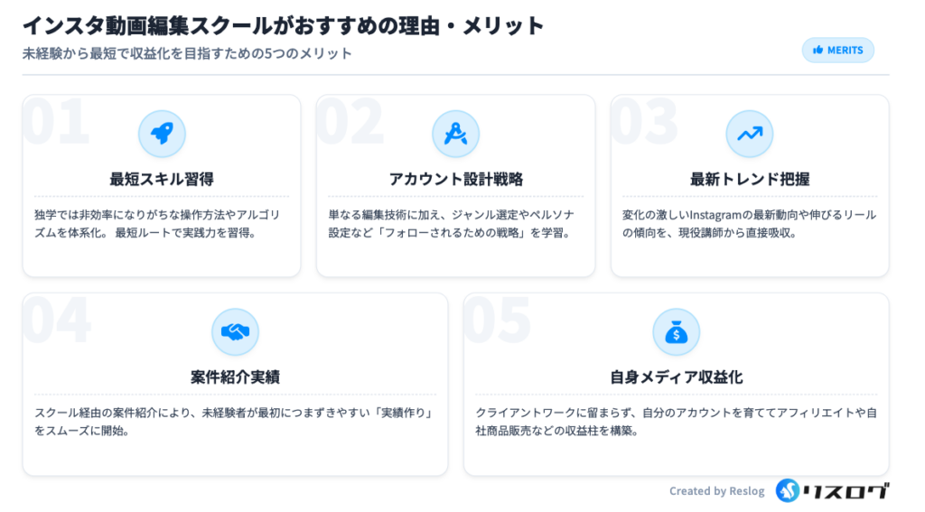 単発の副業にとどまらず、中長期で収益の柱を作りたい人にとって、インスタ動画編集スクールは大きな価値があります。