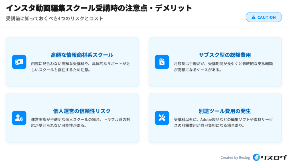 インスタ動画編集スクールの中には、実態として情報商材に近い高額スクールが存在する点に注意が必要です。