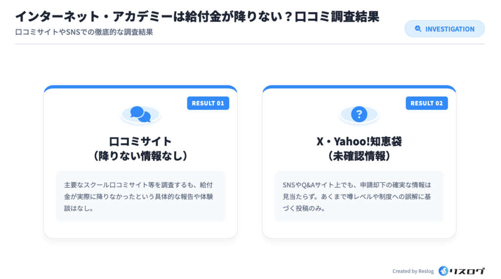 X(旧Twitter)やYahoo!知恵袋といったSNS・Q&Aサイトでも、「インターネット・アカデミーで給付金が降りなかった」という決定的な投稿は見当たりません。