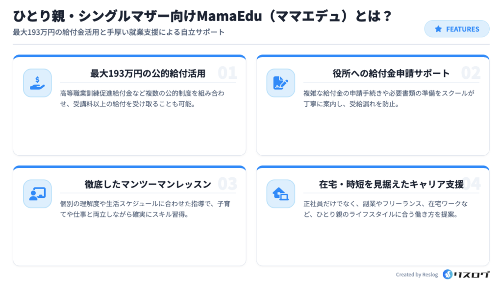 MamaEdu(ママエデュ)は、ひとり親・シングルマザーを対象に、国の公的制度を活用して最大193万円の給付を受けながらIT・Webスキルを学べる支援型スクールです。