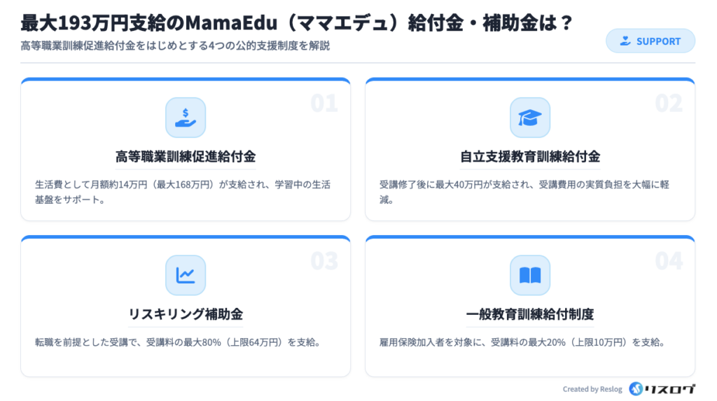 MamaEduは、最大193万円の給付金をはじめとした公的支援制度の活用を前提としたスクールであり、申請手続きのサポートも手厚い点が特徴です。