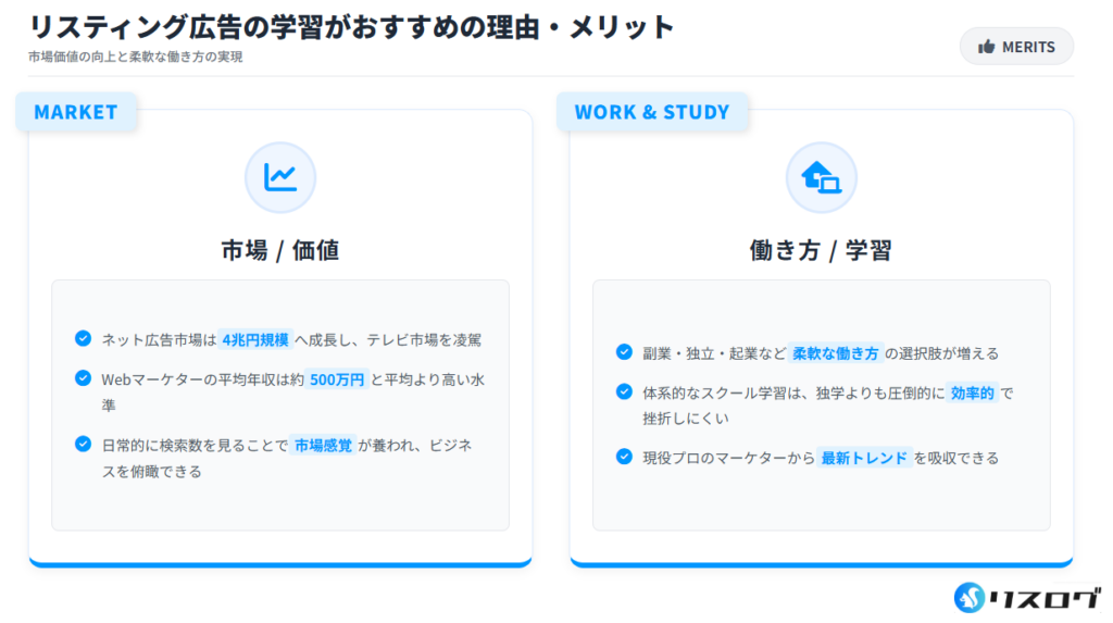 リスティング広告運用をスクールで学ぶことは、独学に比べて遥かに効率的です。