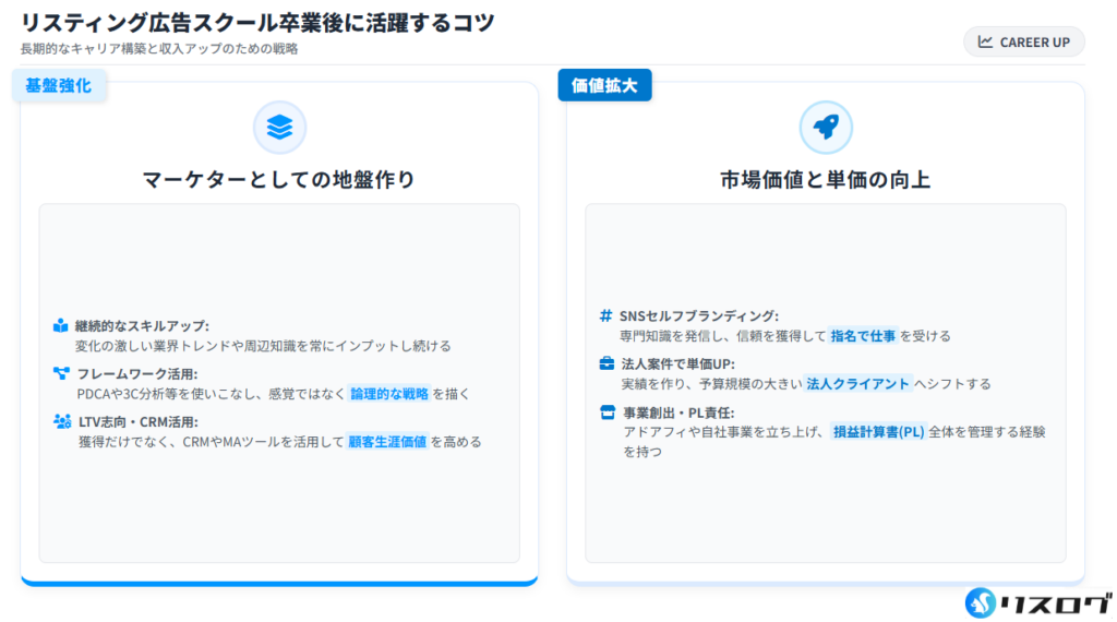 リスティング広告業界は常に進化し続けているため、スクールで学んだ知識だけで長期間にわたり通用するわけではありません。