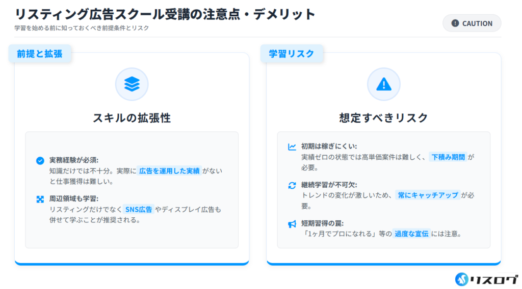 短期間で習得可能とするスクールは、基礎的な座学だけに終始し、実際の運用スキルを十分に身につけられないリスクがあります。