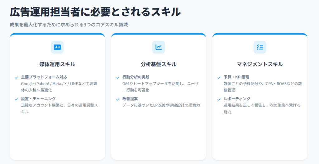 また広告の入稿方法、効果測定・分析手法、運用改善サイクルを熟知していることも重要です。