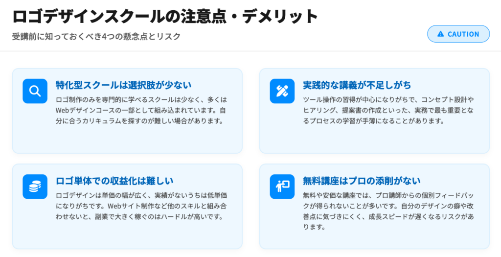 ここではロゴデザインを学ぶスクールを検討する際や、学習を進める上で留意すべき注意点・デメリットとなり得る側面を解説します。