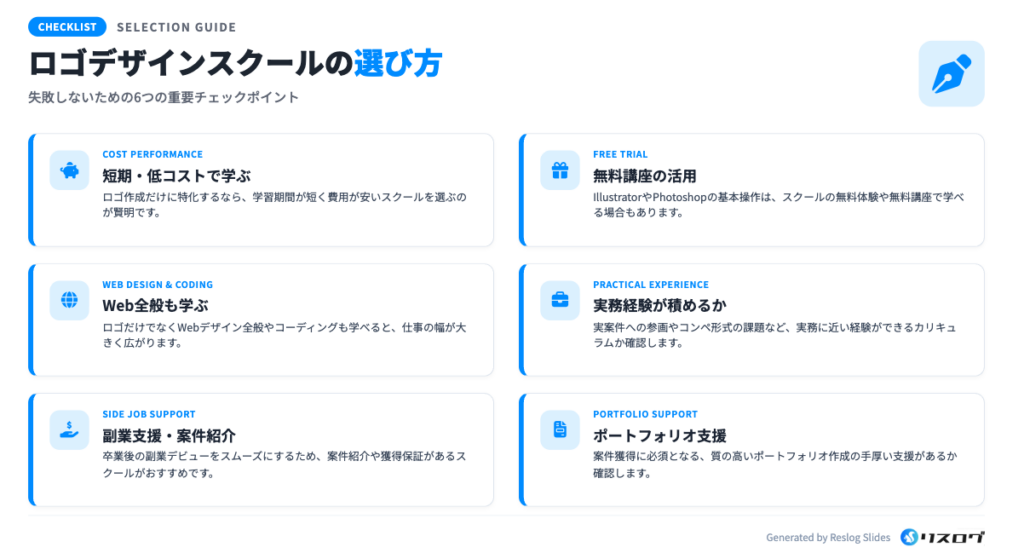 ここではロゴデザインが学べるスクールを選ぶ際に、特に重視すべきポイントを6つ解説します。