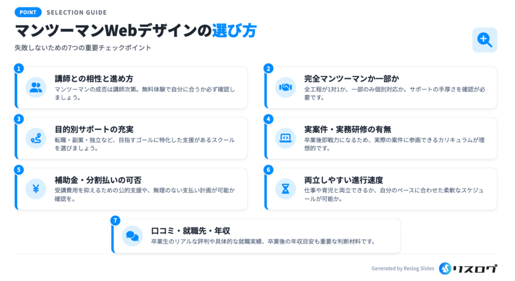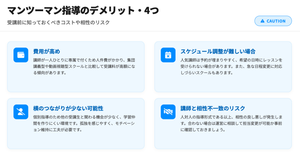 マンツーマン・個人レッスン形式のWebデザインスクールは、きめ細やかな指導が受けられるという大きなメリットがある一方で、いくつか注意すべき点やデメリットとなり得る側面も存在します。