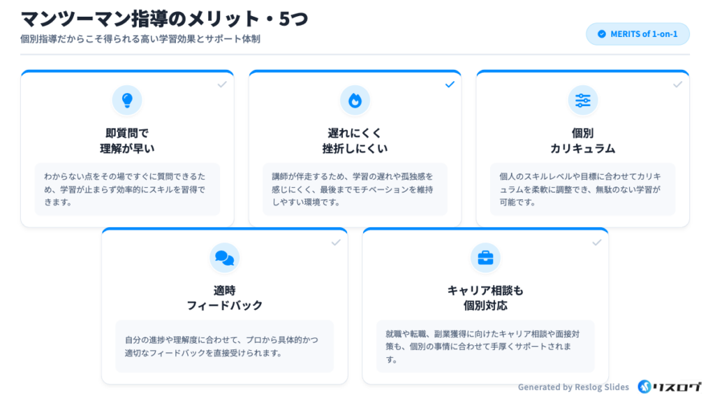 自身の予算と、マンツーマン指導によって得られる価値を慎重に比較検討し、費用対効果を考える必要があります。