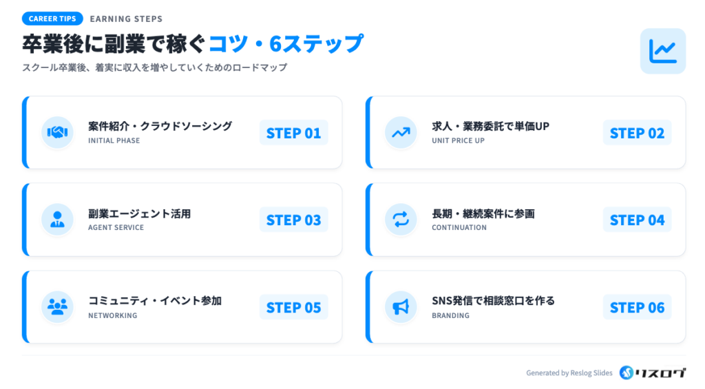 Webデザインスクールで習得したスキルを活かし、本業と両立しながら副業で収入を得るためには、計画的なステップを踏んで実績を積み、自身の市場価値を高めていくことが重要です。