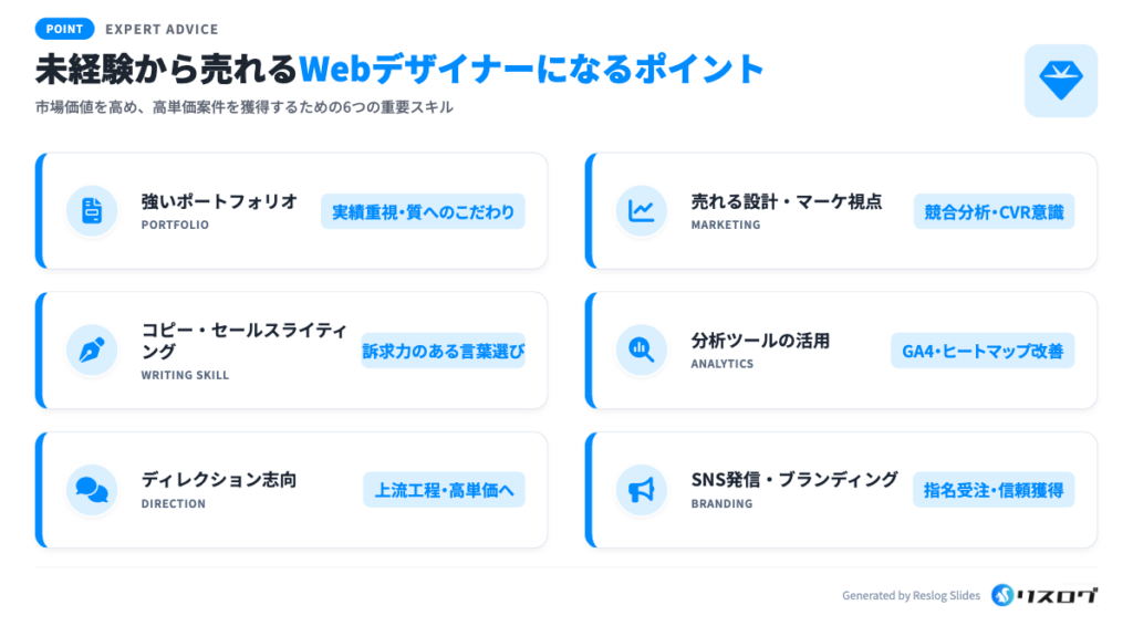 未経験からスタートして、市場価値の高いWebデザイナーへと成長するための重要なポイントを6つ解説します。