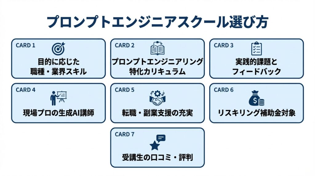 本格的にプロンプトエンジニアを目指すなら、プロンプト設計・改善・評価を体系的に学べるカリキュラムがあるかが重要です。