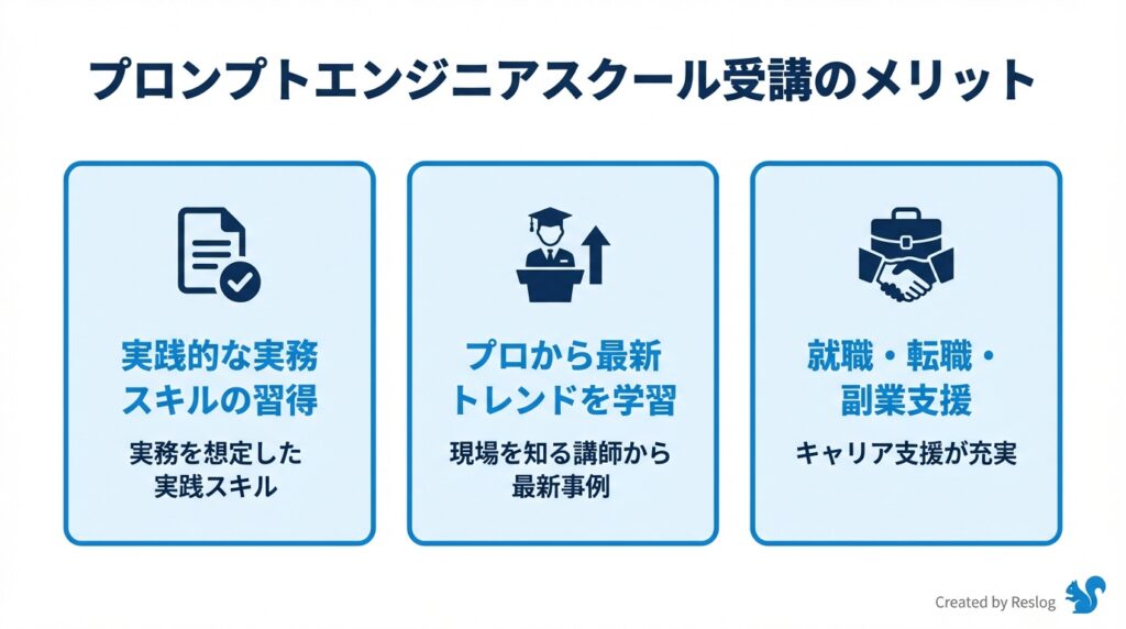 プロンプトエンジニアスクールを受講する最大のメリットは、実務を想定したプロンプト設計スキルを体系的に身につけられる点です。