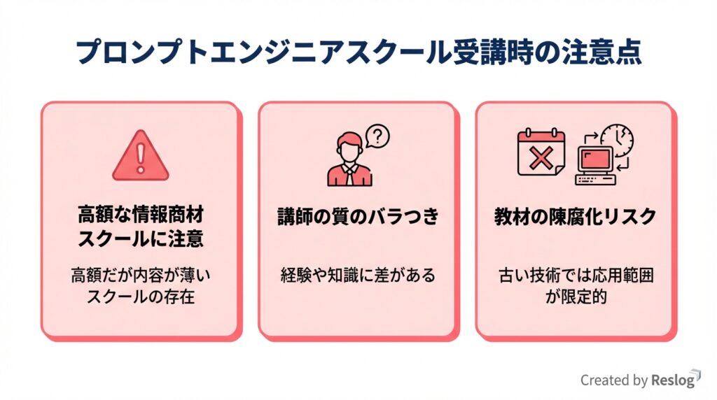 そのため、教材の更新頻度が低いスクールでは、すでに使われなくなった手法や非効率なプロンプト設計を学んでしまう可能性があります。