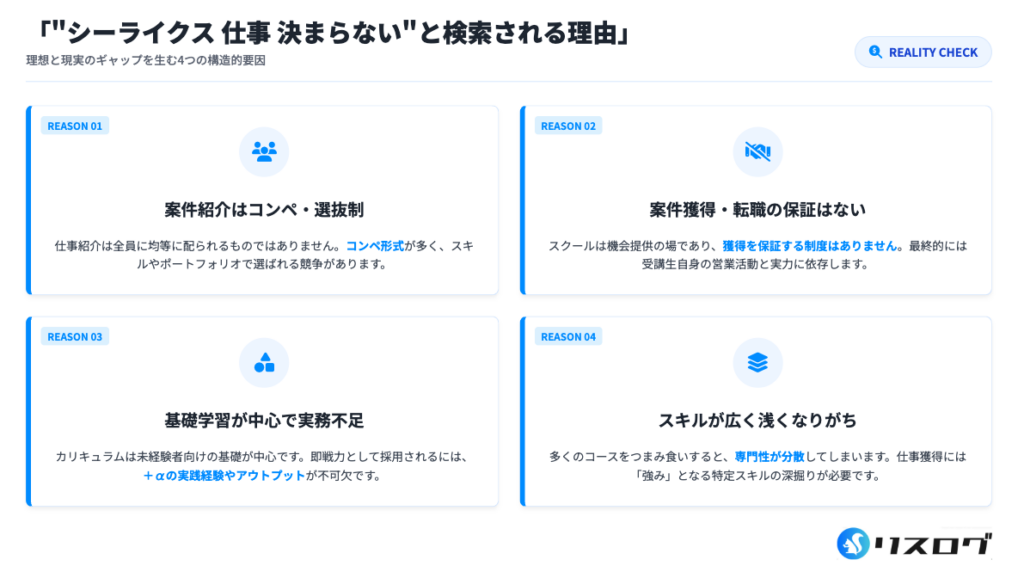 シーライクスは「案件保証」や「転職保証」を提供しているわけではありません。あくまでスキル習得とキャリア支援が中心であり、仕事獲得は受講生自身の努力に依存します。