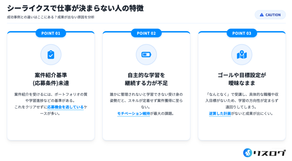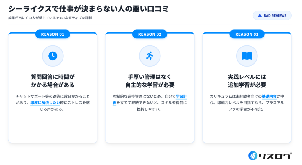 「シーライクスは意味ない」という声の背景には、受講後すぐに仕事が決まると期待していた人が、現実とのギャップを感じるケースがあります。