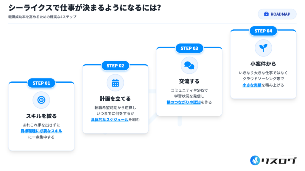 案件獲得には「見てもらう努力」が必要です。シーライクスのコミュニティで情報交換したり、SNSで学習過程や制作物を発信することで、認知度が上がり、仕事のチャンスが広がります。