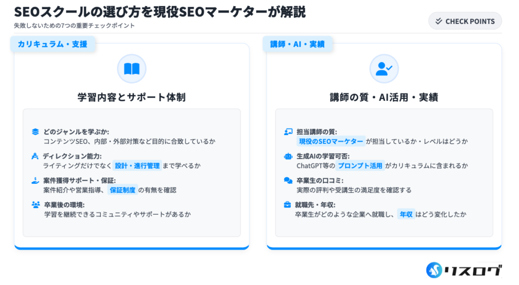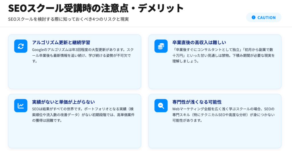 SEOスクールを選ぶ際に注意すべき点は、Webマーケティング全般を網羅的に教えるスクールはSEOの専門性が浅くなる可能性があることです。