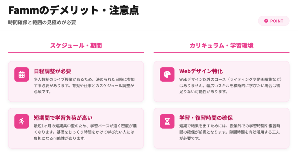 Fammは最短1ヶ月で完結する短期集中型のスクールです。効率的に学べる反面、学習スピードが速いため、基礎をじっくり理解したい方や復習時間を確保したい方には負担が大きい場合があります。
